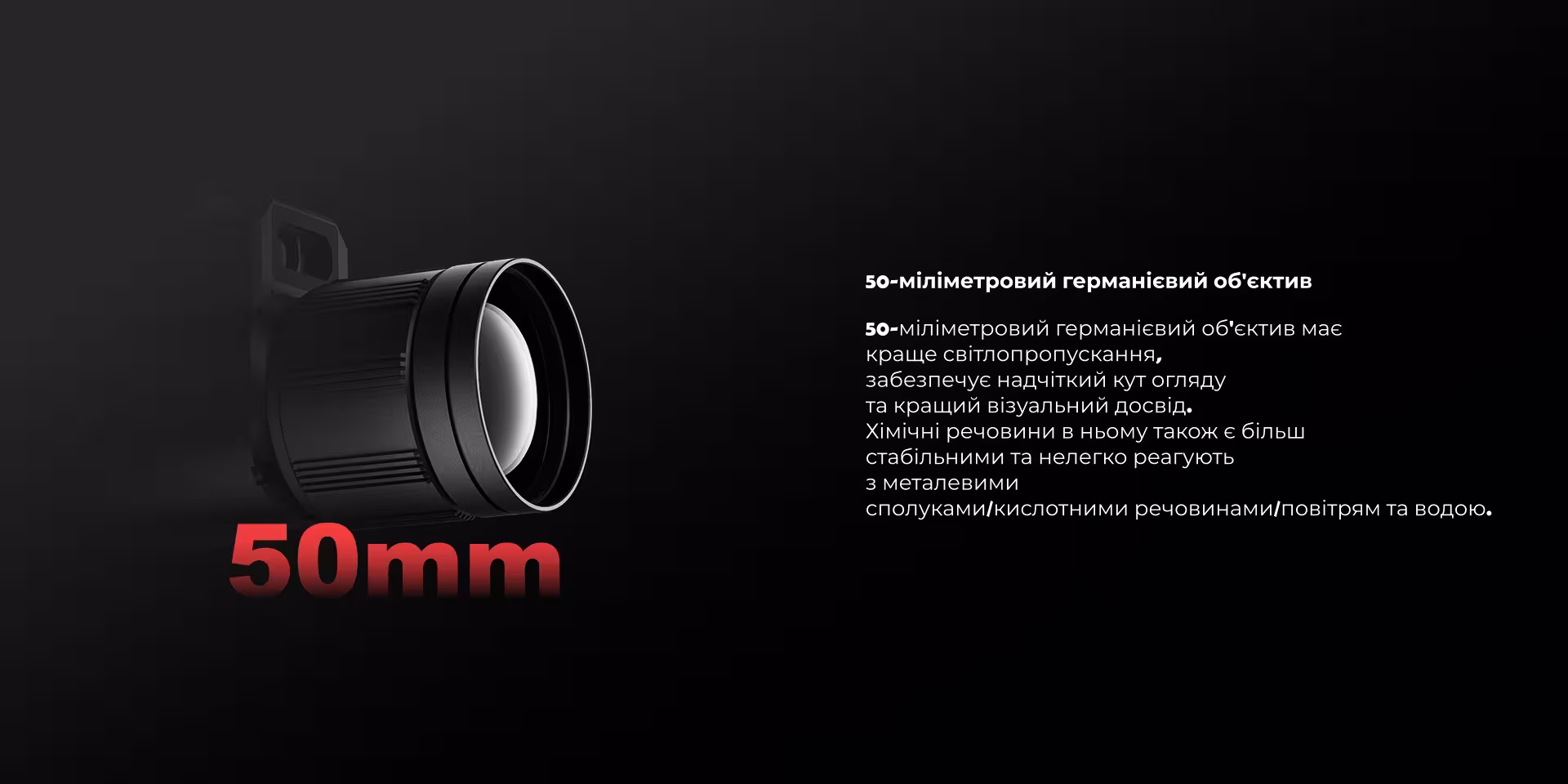 Потужна Оптика: Об'єктив 50мм з діафрагмою F1.0 та базовим збільшенням 2.8x забезпечує широке поле зору 8.8°x6.6° та вражаючу дальність виявлення цілей (розміром 1.7м х 0.5м) до 2500 метрів. Цифровий зум 1x/2x/4x/8x дозволяє наближати зображення для детального аналізу.
