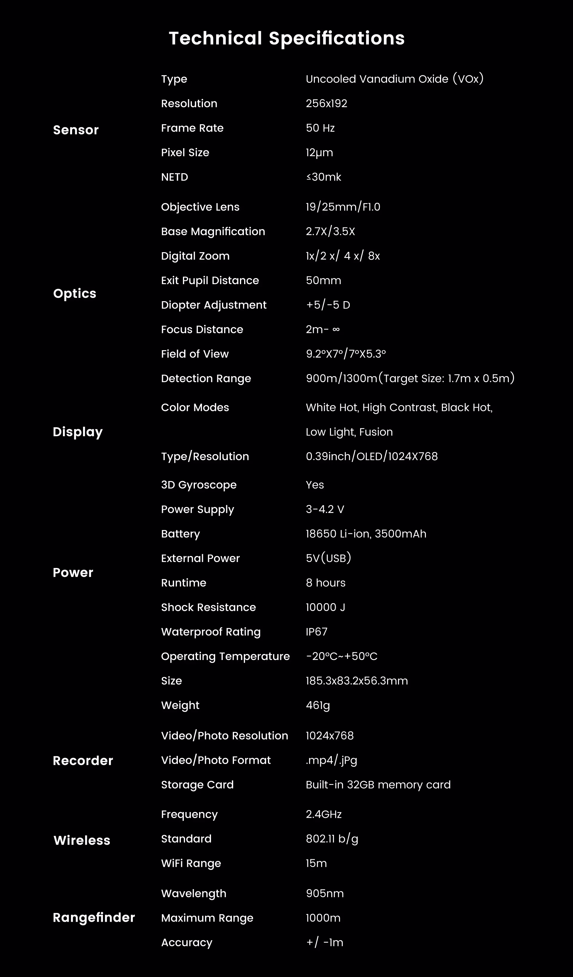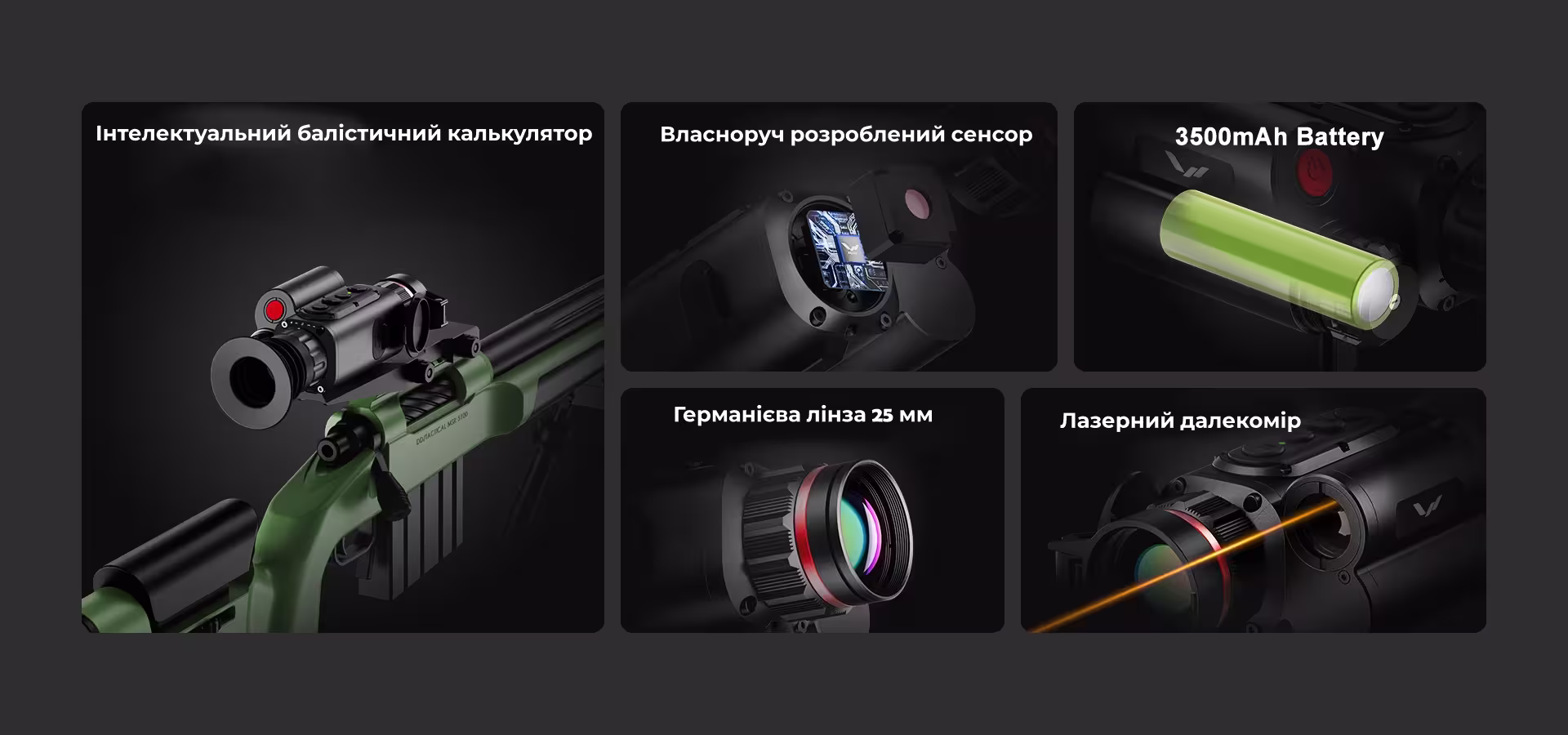 Оптична досконалість: Германієвий об'єктив 25 мм зі світлосилою f1.0 забезпечує базове оптичне збільшення 3.5х. Цифровий зум від 1х до 8х дозволяє досягти загального збільшення до 28х, а широке поле зору 7°x5.3° (12.2 x 9.3 м на 100 м) надає чудовий огляд.
