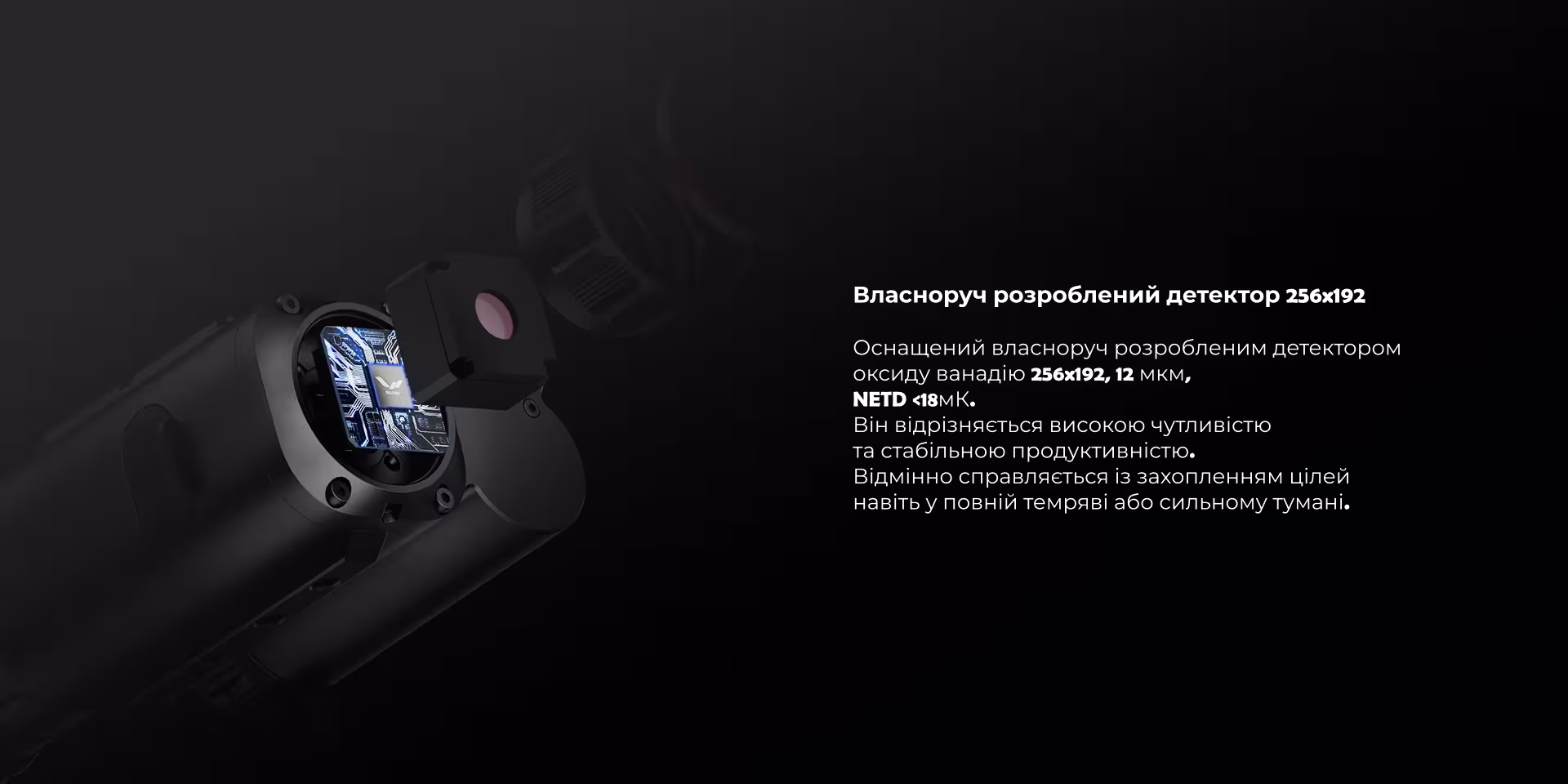 Чутливий Сенсор: Оснащений неохолоджуваною VOx-матрицею з роздільною здатністю 256x192 та кроком пікселя 12 мкм. Висока чутливість (NETD ≤30 мК) дозволяє фіксувати найдрібніші температурні відмінності, забезпечуючи детальне та насичене зображення. Частота оновлення 50 Гц гарантує плавну картинку без затримок навіть при спостереженні за рухомими об'єктами.