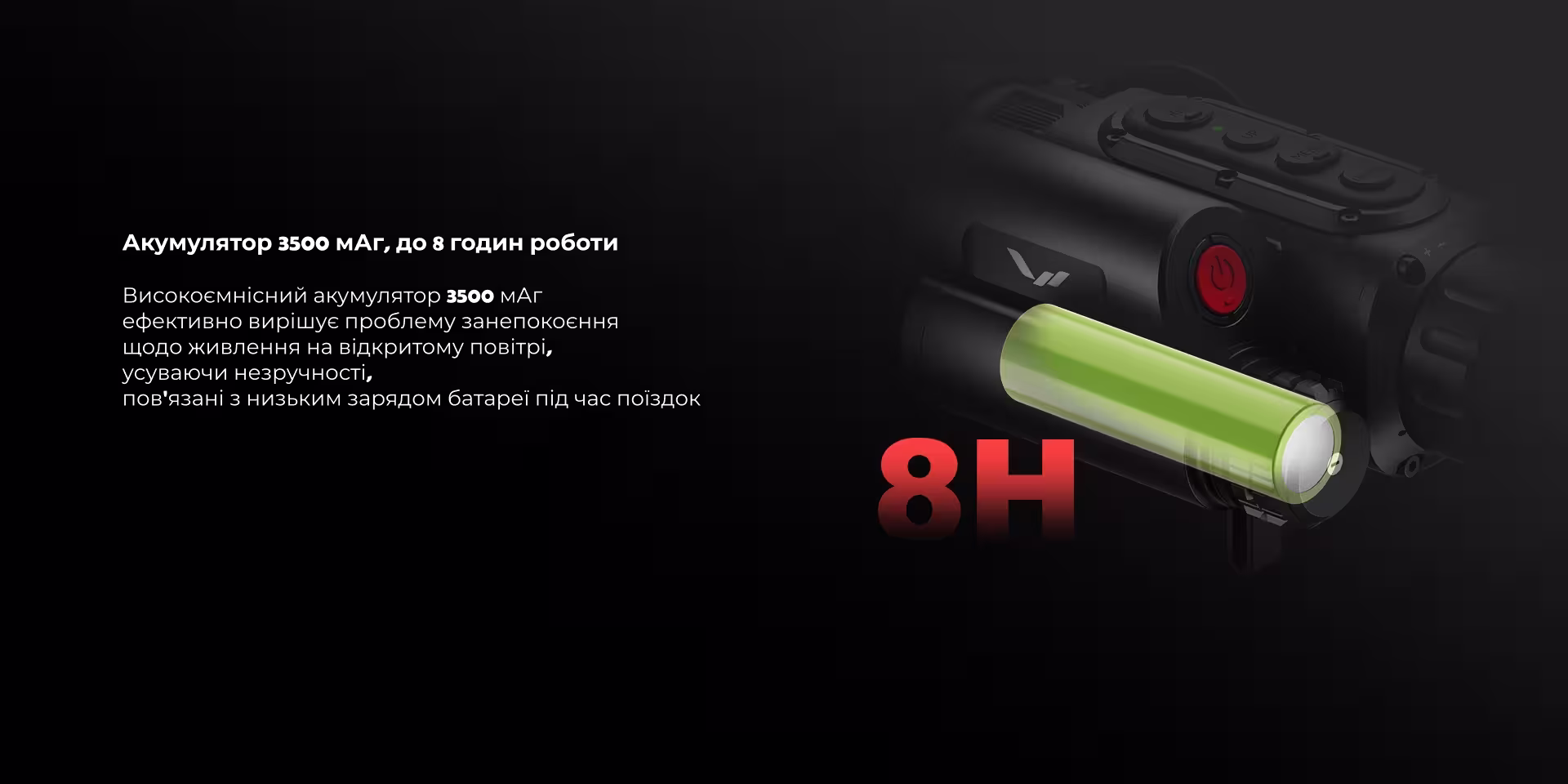 Тривала Автономність та Міцність: Джерелом живлення слугує акумулятор 18650, що забезпечує до 8 годин автономної роботи. Міцний корпус з магнієвого сплаву має захист рівня IP67, стійкий до віддачі до 6000 Дж, та витримує несприятливі погодні умови.