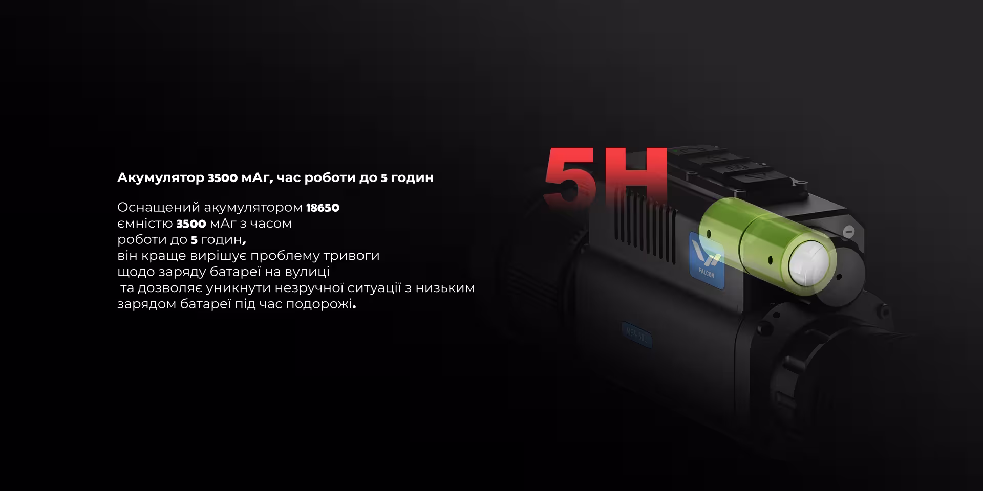Тривала Автономність: Живлення від однієї батареї 18650 (3500 мАг) забезпечує до 5-6 годин безперервної роботи, а можливість підключення зовнішнього джерела живлення через USB (5В) збільшує гнучкість використання.