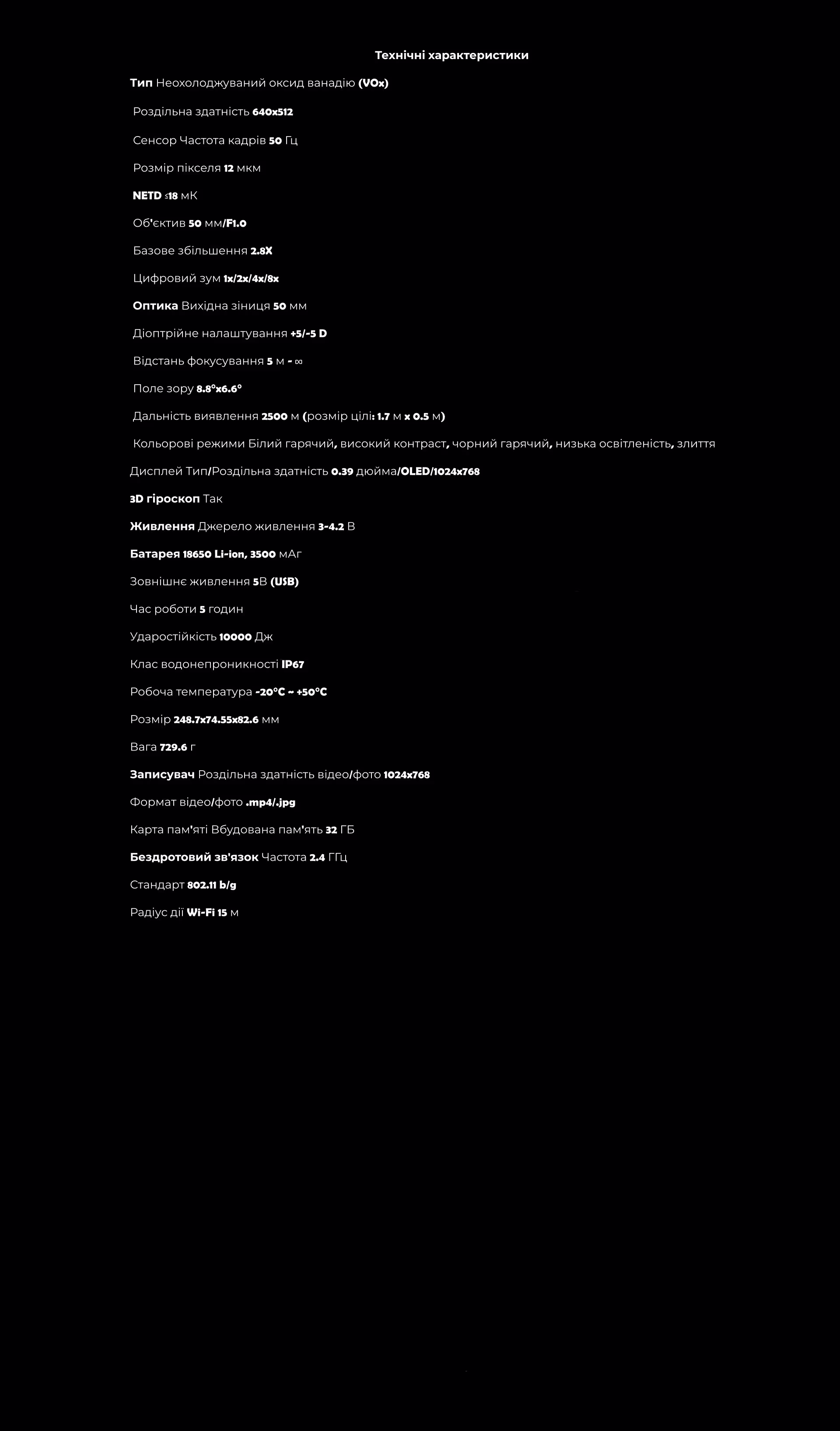 Потужна Оптика: Об'єктив 50мм з діафрагмою F1.0 та базовим збільшенням 2.8x забезпечує широке поле зору 8.8°x6.6° та вражаючу дальність виявлення цілей (розміром 1.7м х 0.5м) до 2500 метрів. Цифровий зум 1x/2x/4x/8x дозволяє наближати зображення для детального аналізу.